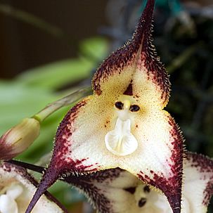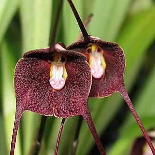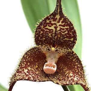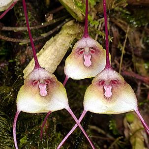 Monkey orchid is the popular name given to orchids of the genus Dracula, which are notable for their flowers resembling the face of a monkey. The name Dracula refers to the mythical Count Dracula, the master of vampires. This name was chosen due to the red color of many species and the long extensions at the tips of the sepals, resembling the long canine teeth of a vampire. This genus includes about 122 species, the majority of which are endemic to the western side of the Andes mountain range, in areas of Colombia and Ecuador. They are epiphytic orchids, thriving in high humidity environments and growing at altitudes between 2,953 and 6,562 feet (900 and 2,000 meters).